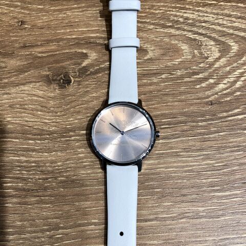 ピンクの文字盤に白の革ベルトが上品で美しい時計です。