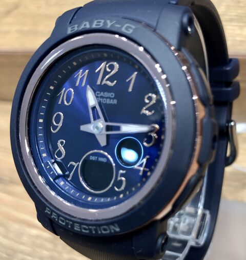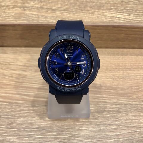 落ち着いたマットなネイビーにメタリックな文字板が美しい時計です。